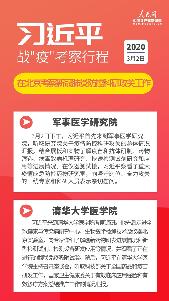 3月2日,习近平在北京考察新冠肺炎防控科研攻关工作,代表党中央向奋斗在疫情防控科研攻关一线的广大科技工作者表示衷心的感谢和诚挚的问候。