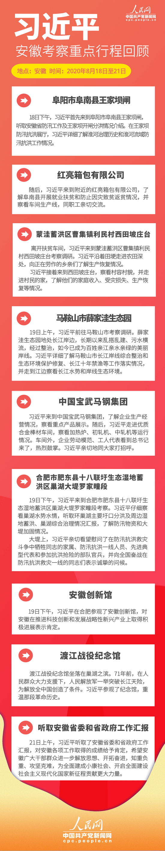 8月18日至21日,习近平来到安徽,看望慰问受灾群众和防汛救灾一线人员,就统筹推进常态化疫情防控和经济社会发展工作、加强防汛救灾和灾后恢复重建、推进长三角一体化发展、谋划“十四五”时期经济社会发展进行调研。
