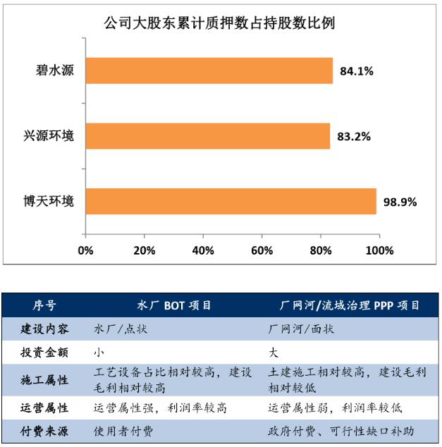 这是近两年来环保行业上市公司特别是从事PPP业务的公司普遍面临的局面,民营环保上市公司由于融资能力更弱,在行业波动的时候面临的困难更大,同时多数民营环保企业实控人还存在较多的股票质押情况,市值的大幅下滑继而引发股票质押风险。对于民营环保上市公司来说,不仅短期压力更大,同时还存在长期持续发展的难题。