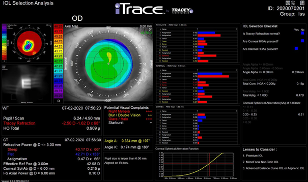 于是,周阿姨在朋友的推荐下,来到合肥爱尔眼科医院就诊。经过系统的检查、分析评估后,刘勇院长及李凯主任带领的白内障团队根据周阿姨的眼睛生物测量数据,结合周阿姨的工作、生活及用眼需求,最终决定为周阿姨制定个性化的手术方案:飞秒激光辅助白内障超声乳化+PanOptix新一代三焦点人工晶体植入术。