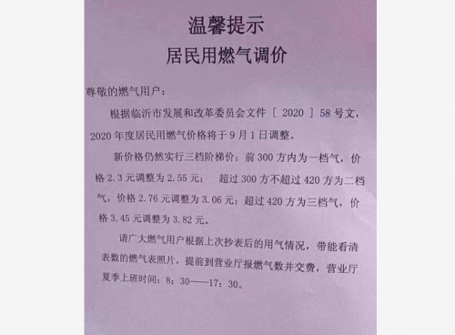 近日,临沂发布燃气调价的通知,根据临沂市发展和改革委员会文件[ 2020 ] 58号文,2020 年度居民用燃气价格将于9月 1日调整。新价格仍然实行三档阶梯价:前300方内为档气,价格2.3元调整为2.55元;超过 300方不超过420方为二档气,价格2. 76元调整为3.06元;超过420方为三档气,价格3.45元调整为3.82元。