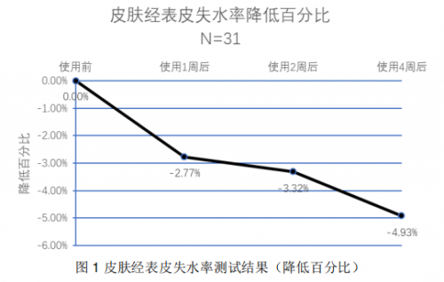 可以看出,在针对31位受试者使用A.O.史密斯美容软水1周,2周,4周后分别进行测试,我们发现,皮肤水分流失率都较初始值有所降低。这证明了美容软水让受试者们的皮肤锁水能力都得到了有效提升。