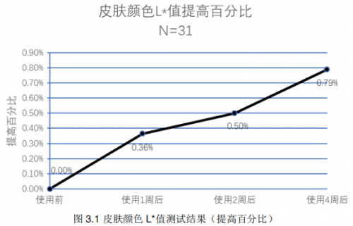 通过以上乳酸刺痛测试结果看出,与初始值相比评分均值均有显著性差异。使用2周,4周后,10%乳酸侧评分均值显著性减小了2.3,3.0;在使用产品2周,4周后,10%乳酸侧评分均值降低了35.15%,46.04%。这说明皮肤的敏感问题得到了有效的改善。