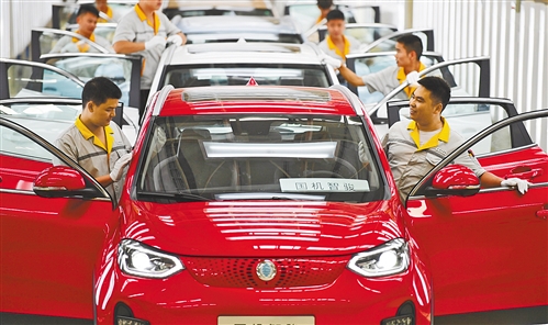 7月16日,江西赣州新能源科技汽车城,国机智骏汽车有限公司员工在检测即将下线的新能源汽车。刘青摄(中经视觉)