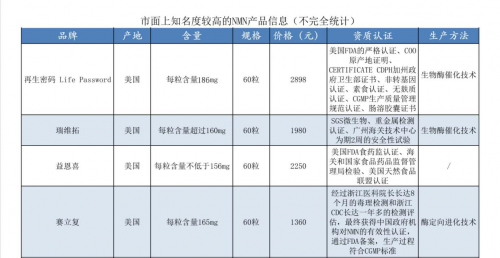 NMN是NAD+的前体,NAD+作为人体固有物质,参与细胞能量产生、线粒体代谢,葡萄糖分解、脂肪氧化等众多生理反应,增强修复能量,使细胞不断再生,可以大大减轻甚至逆转DNA的损伤速度,从而促进细胞的活化,进而增强人体免疫力,提高人体抗病毒、抗感染的能力。市场的火爆需求让不同品牌的NMN竞争变得愈来愈激烈,知名度较高的有再生密码Life Password、维瑞拓等品牌,其中NMN含量、纯度(高达99.9%)最高的是来自美国再生密码集团的产品NMN11000,超高的性价比也让再生密码跑赢市场其他品牌,位居市场头部。下图为市场热度排名领先的部分NMN品牌。