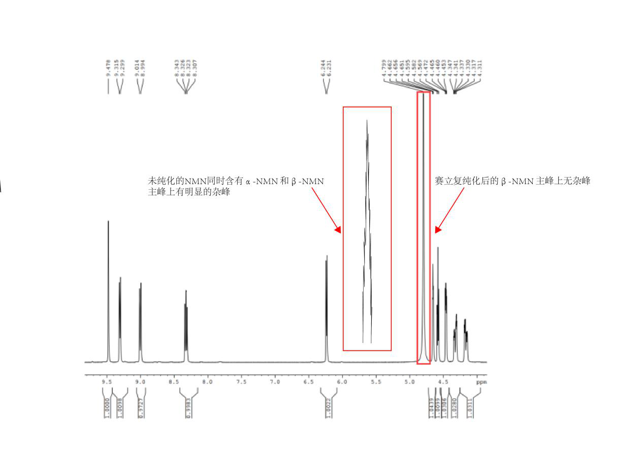 赛立复研究发现生物体中天然的NMN是β-NMN,其他如α-NMN等异构体不具有活性,但常规合成方法合成的NMN,其中β-NMN含量只有60%【1】,这样合成出来的NMN安全隐患极高。因此赛立复对NMN进行了难度极高的手性分离。
