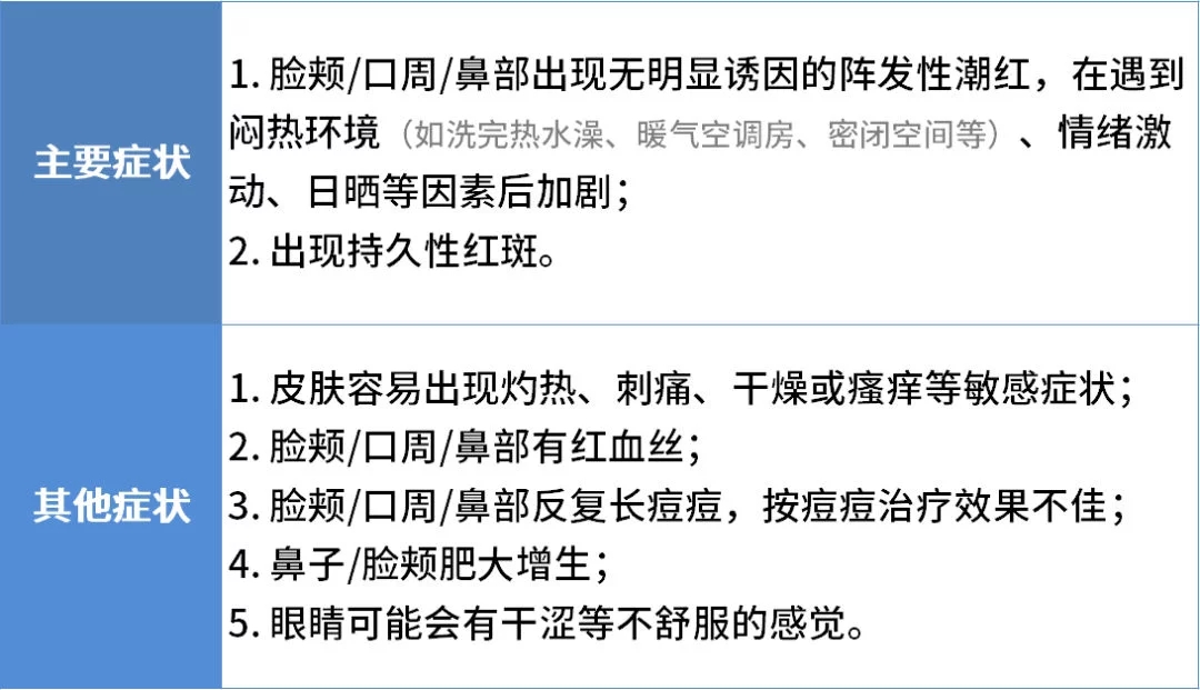 当你的皮肤出现以上主要症状+1条或以上的其他症状时,很可能已经患上「玫瑰痤疮」了,建议