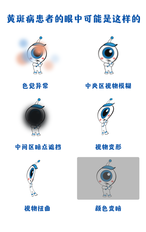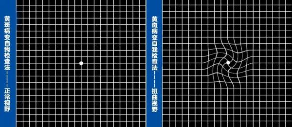 「干性」主要是视网膜内出现黄色小点状的沉积,初期视物昏朦,像是轻纱薄雾遮挡。随着病情发展,视物模糊逐渐加重,眼前出现固定暗影,视物变形。