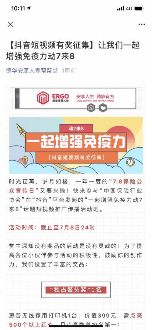 为让更多消费者了解7.8主题宣传内容,德华安顾人寿充分利用官方微信订阅号、官方网站、抖音平台做好活动预热、推广工作,先后发布7.8主题海报及活动介绍、持续进行科普保险知识宣传。同时,德华安顾人寿各分支机构充分发挥营业网点优势,积极利用LED屏、横幅、易拉宝等形式进行活动宣传。为发挥各机构及员工参与活动的主观能动性,德华安顾人寿聚焦“7.8保险扶贫健康操”、“一起增强免疫力动7来8”短视频推广传播,专题开展了“【抖音短视频有奖征集】让我们一起增强免疫力动7来8”活动,鼓励各机构结合当地实际,积极开展与活动主题相关的自主性、创新性活动,对于在捐赠步数和录制抖音视频环节中表现优异者,将给予奖励。该活动进一步激发了各机构员工拍摄发布个性化健康锻炼、舞蹈与保险知识普及类短视频的热情,在提升行业形象的同时,让更多人走近保险、了解保险,展示了保险人健康向上的行业形象及德华安顾人良好的精神风貌。