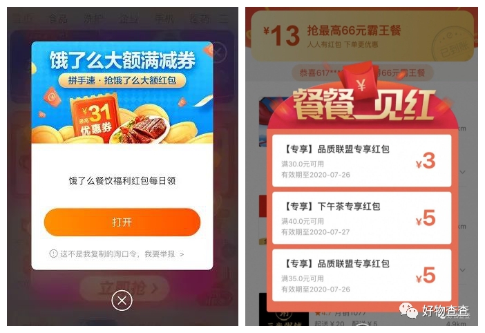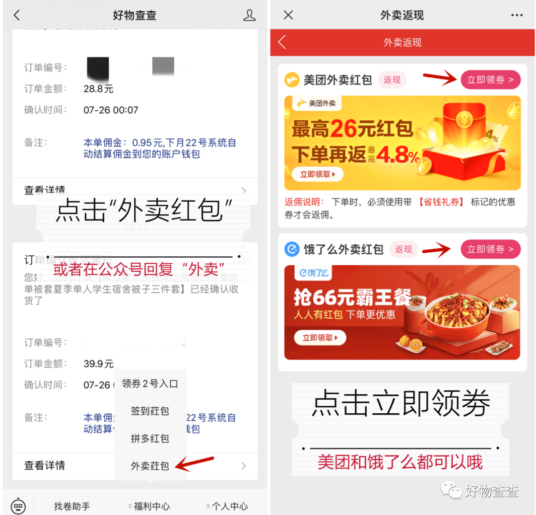 大多数朋友都不知道点外卖也能领红包和返现,所以今天我把在【好物查查】公众号点外卖的返佣流程介绍给大家,让更多的朋友知道。希望大家不要看不起几块钱的返利,因为大家的钱都是一分一分省出来的哦~。