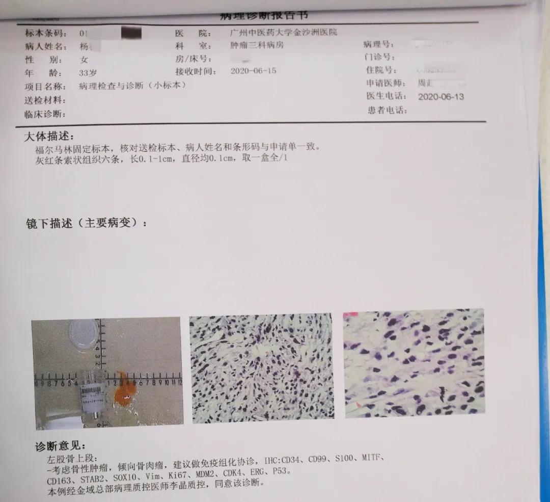 3 月29日,疼的实在受不了的杨女士在广西某医院做了左股骨上段病变穿刺活检术,术后病理显示:左股骨上段普通型骨肉瘤(软骨母细胞型)。