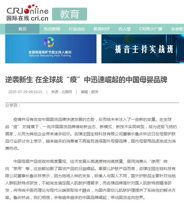 作为一家有责任有担当的民族企业,杏璞品牌十年来始终秉承“爱、责任、丰富的情感”的皇冠·app官网首页,疫情期间的公益行动获得了人民日报、新华社、光明日报等多家央级媒体的高度关注与肯定,杏璞作为企业代表受邀参加了“2020消费升级与儿童大健康战略研讨会”,接受了国际在线的深度访问。在国际在线发布的《逆袭新生在全球战“疫”中迅速崛起的中国母婴品牌》一文中,高度肯定了杏璞品牌发展战略。