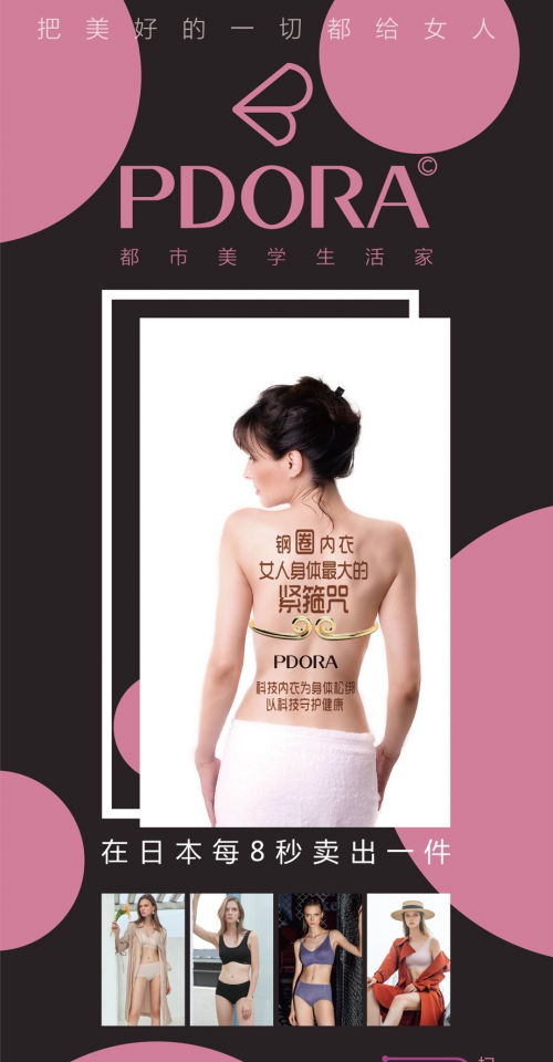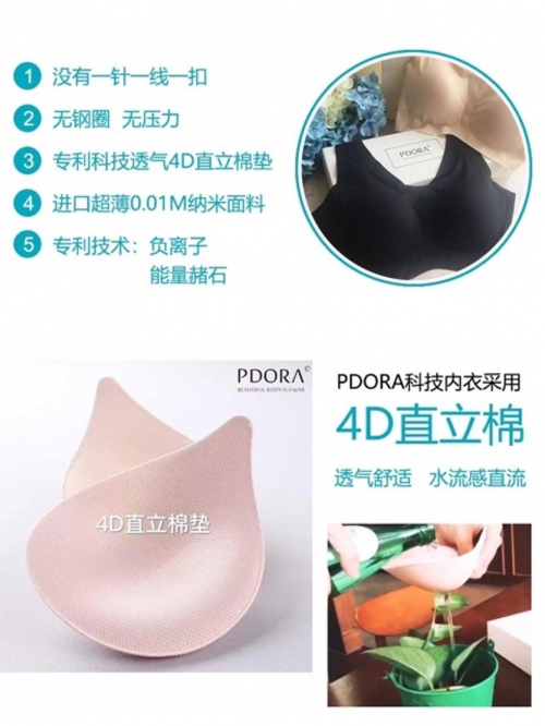 对于女人来说,每天贴身穿着时间最长的应该就是文胸了。这也就意味着,文胸扮演了很重要的角色。无论是出于舒适度角度考虑还是健康体验方面,在选择文胸的时候女性朋友都应该更加重视一些。现在很多文胸打着聚拢的名号,但其实会给乳腺带去伤害。而PDORA文胸,不挤不压,依然能够承托出迷人的曲线美!