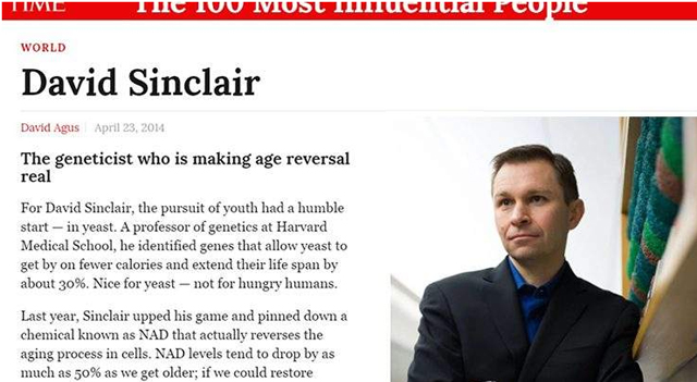 2018年3月《细胞》发表研究报告,展示了NMN成功逆转老龄动物肌肉萎缩与血管死亡的成果,其效果大幅提升肌体活力,高龄动物中采用NMN的个体,体力超出其他动物五成以上。正因如此,David A. Sinclair教授被《时代》杂质评为100位最具影响力的人物之一。