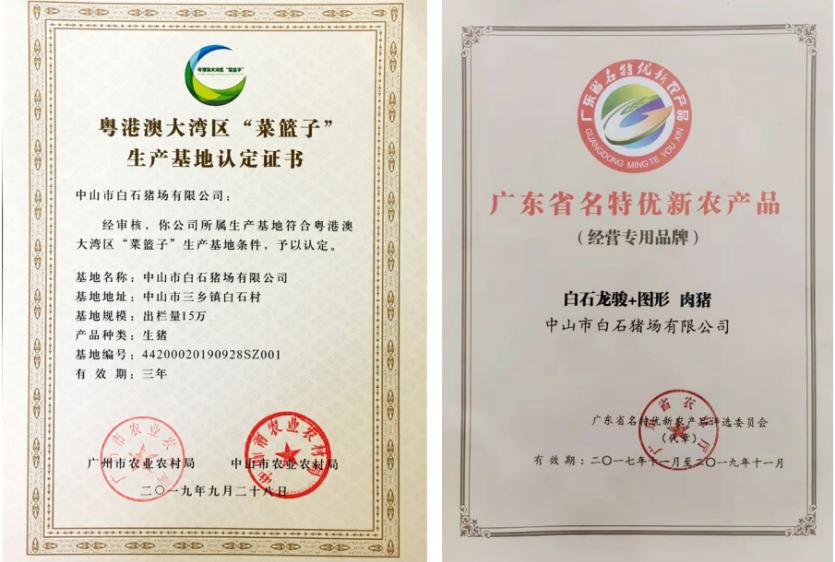 白石猪场自成立以来,始终坚持以产品质量为企业立身之本的理念,不但得到了行业和广大消费者的认可,还获得了政府及相关单位的肯定与褒奖。白石猪场龙骏种猪在2003、2006和2009年连续三届被评为“广东省名牌品”称号,龙骏牌肉猪获得国家《无公害农产品》认证,公司先后在中山市、珠海市开设了50多家白石龙骏”无公害猪肉专卖店,为中山珠海两地市民提供真正的无公害安全猪肉,受到了市民的欢迎。在中国农业博览会上,龙骏大白猪和龙骏杜洛克种猪双双获得名牌产品称号。龙骏种猪还被中国名牌商品协会评为全国同行业十大知名品牌。白石猪场连续多年被评为广东省养猪先进企业,先后荣获中山市先进集体、广东省职工职业道德建设先进集体、广东省先进集体、广东省工人先锋号、广东省“五一”劳动奖章、全国畜牧行业优秀企业、全国养猪行业百强优秀企业、中国改革开放养猪30年企业自主创新发展成就奖等光荣称号。早在 2001 年就在同行业中脱颖而出, 率先通过ISO9001:2000 国际质量管理体系认证,发挥其卓越优势, 成为国家第一批生猪核心育种场、全国生猪标准化示范场、国家重大专项研究基地、国家科技部农业科技成果转化基地、国家生猪产业体系中山综合试验站,以及“十五”国家重大科技专项食品安全关键技术广东示范基地、广东省健康农业科技示范基地、广东高校产学研结合示范基地。与此同时,白石猪场还荣获中国畜牧业协会常务理事单位、中国畜牧业协会猪业分会副会长单位、中国机械化养猪协会副会长单位、广东省养猪行业协会副会长单位、广东省菜篮子工程协会常务理事单位、广东省原种猪场、广东省名特优新农产品、“白石龙骏猪” 品牌为首届(中国)健康美食品鉴会食材指定供应商、中山名优食材以及粤港澳“大湾区” 菜篮子生产基地认定证书、2019 年中国农牧业风云榜“年度猪业保供给杰出贡献奖”等一系列荣誉。