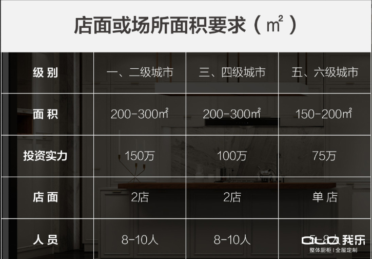 作为上市企业,我乐家居秉承着对股东负责,对客户负责,对员工负责的态度,严格把控招商加盟的准入门槛。除了从资金实力、人员配置、资源人脉、个人修养、带队能力等多个维度来严格甄选加盟商外,更会根据不同量级的城市,制定与城市经济实力相适配的店面开设标准,最大化的挖掘当地市场潜力,帮助当地我乐家居加盟商获利。