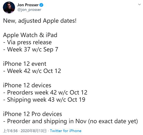 8月13日上午,海外数码博主 Jon Prosser 爆料了苹果秋季新品的最新安排,新 Apple Watch、新 iPad、iPhone 12、iPhone 12 Pro 将从九月开始陆续和大家见面。