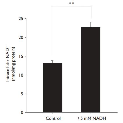 上图显示:给正常细胞添加5mM NADH两2小时后的效果,可以看出细胞内的NAD+水平显著提升。说明NADH能够高效的提升NAD+水平。