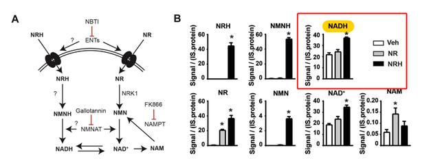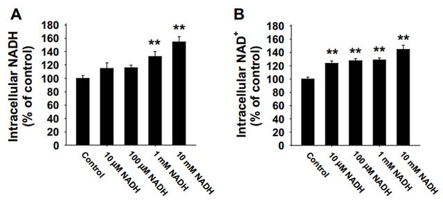 上图是通过给细胞添加NADH一小时后,细胞内NADH(A)和NAD+(B)的浓度变化。可以发现所有NADH浓度都增加了细胞内NAD+水平,但低浓度补充NADH时,细胞内NADH水平变化不明显。