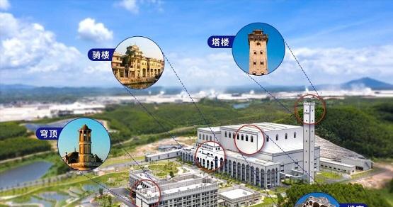 为了使项目建筑与当地田园风貌和建筑风格融合在一起,项目设计时以碉楼作为设计理念,塔楼、花式穹顶、骑楼、楼窗等外观装饰,使得整个项目与开平碉楼群极为相似。