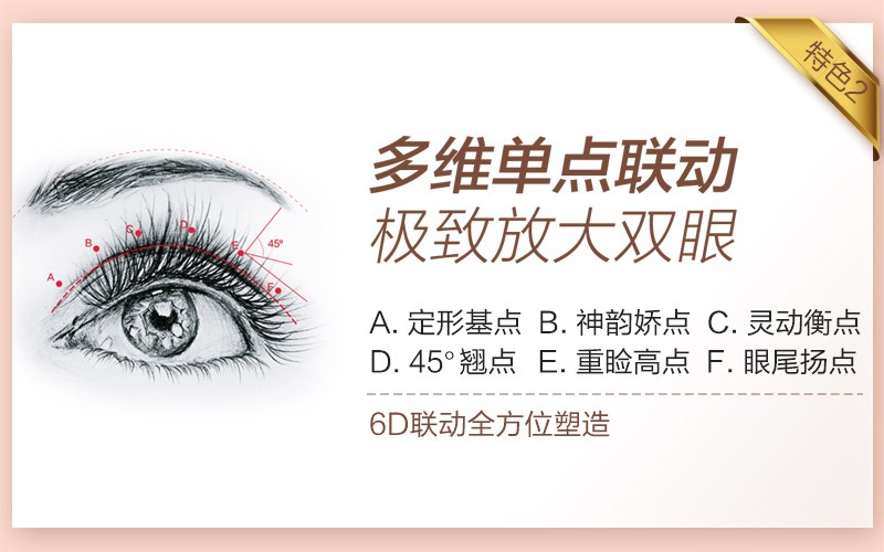 5、综合眼部神韵焦点,灵动平衡点,眼尾仰点等六维睫毛牵引,达到四十五度翘睫灵动的效果;