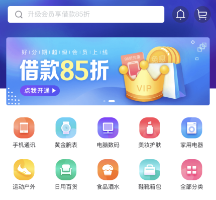 在互联网消费金融发展的当下结合年轻人的消费痛点,成立了线上好分期商城。商品主要以年轻时尚品牌为主,包括黄金腕表、美妆护肤、家用电器、运动户外、日常百货和电子数码等品类。质量方面大家不用担心,好分期与众多金融机构和电商平台以及品牌方建立了合作关系,只为给大家提供有品质保障的产品。