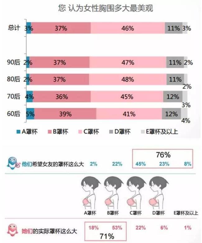 据调查分析,39%单身男性和49%单身女性相信一见钟情,男女双方择偶都比较看重身高、照片等外貌因素。除此之外,更让人觉得惊讶的是有76%的男性希望自己的另一半是C-Cup及以上,其中C-Cup占了近一半,然而事实上大部分的女性胸部不超过B-Cup。对于一个女人来说,除了脸蛋重要,身材也是令人在乎的一个点。有了前凸后翘的好身材,女人才会自信起来。