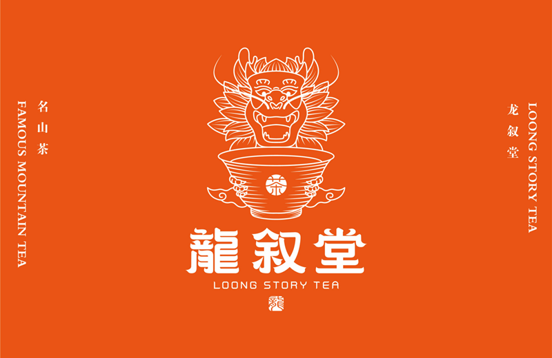 龙叙堂标志以文字与图形融汇展现,以国潮风格描绘龙首盘于茶碗之上,由龙的目光引导入茶碗中,碗内斟满香浓茶汤。龙首面部开口笑颜,端正而不失喜庆,古韵而不失新潮,中英文灵感以龙爪弧度出发,采用繁体汉字设计,使图形与汉字的搭配相得益彰,具备独有的视觉识别。
