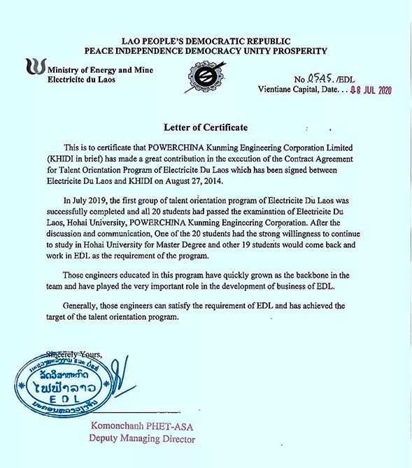 这一项目的成功实践是中国“一带一路”倡议、中老两国民心相通工程的生动体现,该项目于2019年纳入云南省绿色能源国际科技合作基地,今后将为老挝建设“东南亚蓄电池”的国家战略提供有力支撑。下图为老挝国家电力公司2020年7月8日致函感谢电建昆明院院牵头组织实施的“老挝国家电力公司人才定向培养项目”取得丰硕成果。
