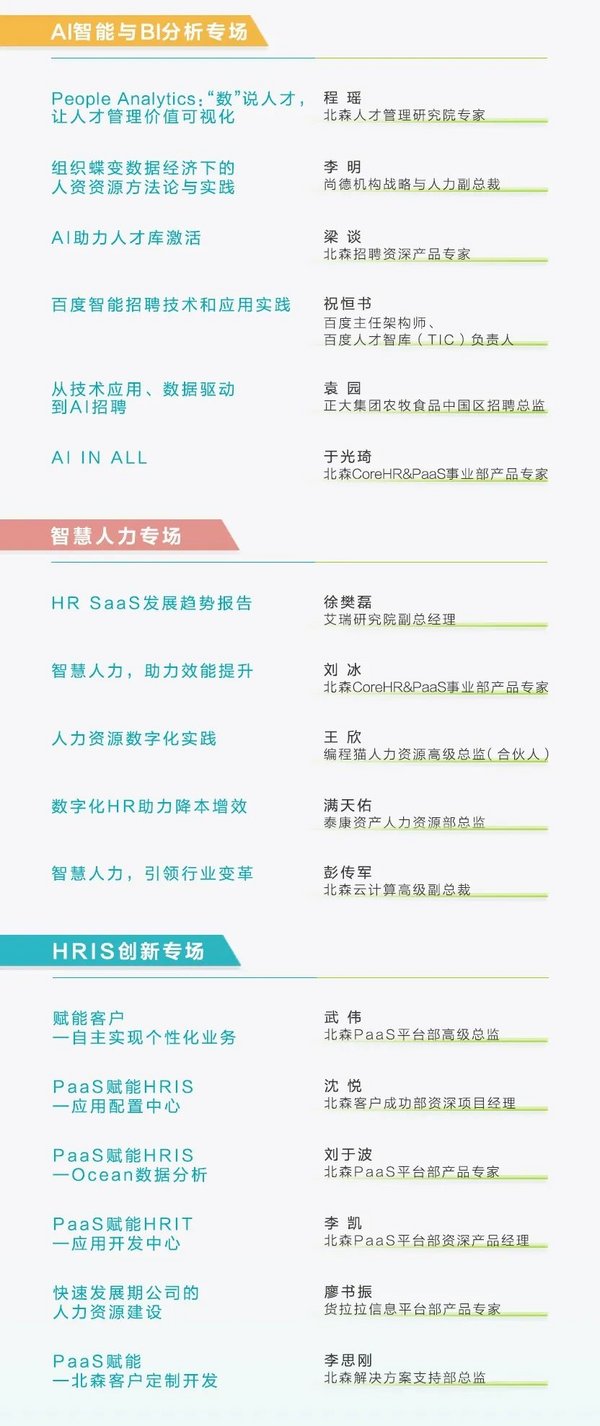 人工智能、大数据、云计算等新兴技术的发展与应用已经成为人力资源数字化转型的重要突破口。而在大会的下午,人才甄选、人才发展、人才效能、AI智能与BI分析、智慧人力、HRIS创新6大分论坛将会平行进行。31个分论坛话题设计,近30+行业专家将分别就招聘和测评、人才盘点和继任、绩效和学习、数据分析、核心人力、PaaS平台的创新等话题进行研讨。