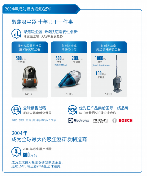 99年开始,抓住了吸尘器市场朝着大功率、无尘袋技术的发展趋势,在中国第一个开发出了大功率手持吸尘器、大功率无尘袋杆式吸尘器、无尘袋卧式吸尘器,大风量龙卷风吸尘器等全新产品,抢占了市场先机,推动了莱克的高速发展。2004年吸尘器产销量达到800万台,一举成为全球最大的吸尘器研发制造商,并保持了连续15年的行业“隐形冠军”。
