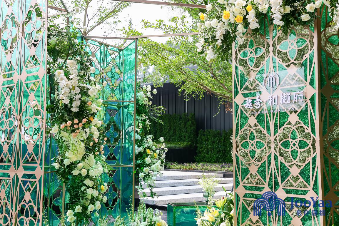 众仰人凭借自己的信条:“每一场活动都是现场直播”,不放过每一处细节。在入口处到营销中心的接待厅,一路上繁花盛开。黑色底面的水系衔接,巨型的绿色透光自然花艺装置,随处可见的流水,绿树,鲜花,这与越秀·和樾府的理念自然生长完美契合,也让宾客从踏入营销中心的一刻,便能感受到“自然流露的美”。