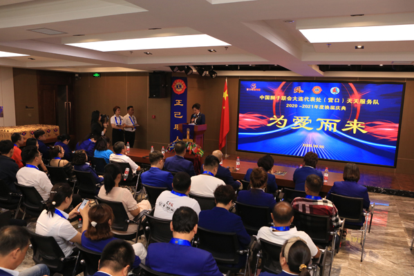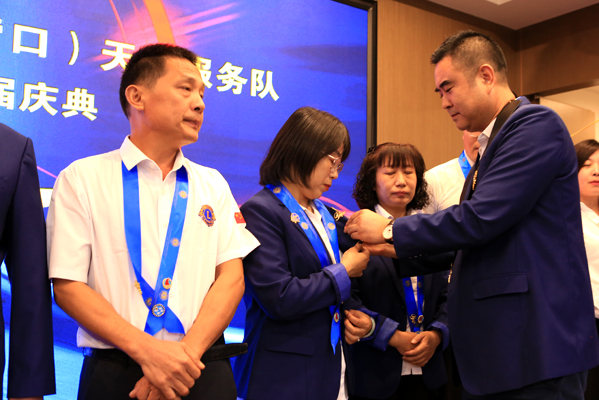 庆典过程中,中国狮子联会大连代表处(营口)天天服务队举行了新老队长交接仪式,中国狮子联会大连代表处第一副主任刘红军女士为董增军先生佩戴绶带、赠送了主席旗,前队长张曼玲女士向董增军先生递交了服务队完整的档案资料。