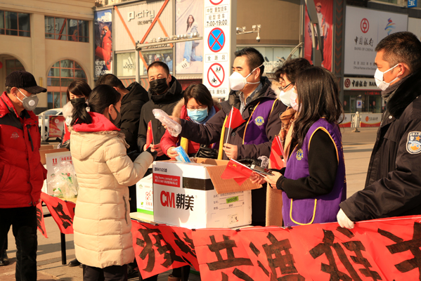 (董增军先生与公司员工在街头向市民发放口罩及消毒液)