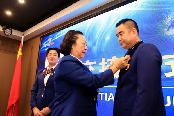 (上一任队长张曼玲为新入会会员佩戴胸章)