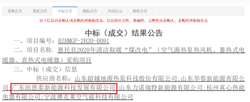 近日,山东省滨州市公共资源交易中心公布了惠民县2020年清洁取暖“煤改电”空气源热泵热风机采购项目中标名单。我国空气能知名品牌——广东纽恩泰新能源科技发展有限公司(以下简称“纽恩泰”)成功中标,为当地居民提供空气能热风机安装、维修等工作。