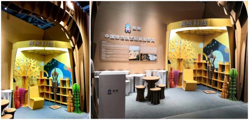 王宗儒说,熊熊环保科技研发生产的BUDDHEART(布达赫特)新材料运用斗拱+乐高式的纸结构搭建理念,既缩短了工期,又提升场馆利用率,更节省参展商成本。就材料回收方面而言,一旦会展结束,传统板材往往就变成了垃圾,或烧或填埋,真正回收利用的占比其实还不到10%,产生的污染极为严重,而BUDDHEART(布达赫特)新材料则可以完全回收接近零污染。除此之外,相比传统板材,BUDDHEART(布达赫特)新材料的价格也便宜很多,而且不需要像传统板材那样找木工师傅进行切割、 做造型。