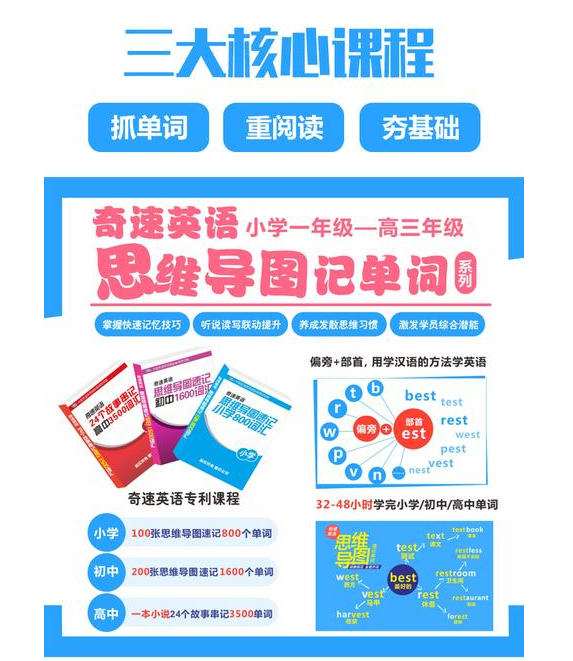 首先,奇速英语推出专利国家课程--专门针对涨分。思维导图速记小学800/初中1600单词,一本小说24个故事连载串记高中3500单词,可以有效帮助中小学生快速提高英语水平。寒暑假精品衔接班(春季班/秋季班/夏令营/冬令营),价格比较适中。同时,里面还有很多英语学习资料,包括单词速记,语法,故事记单词,在线试题(包含解析),时文阅读,美文欣赏等等。