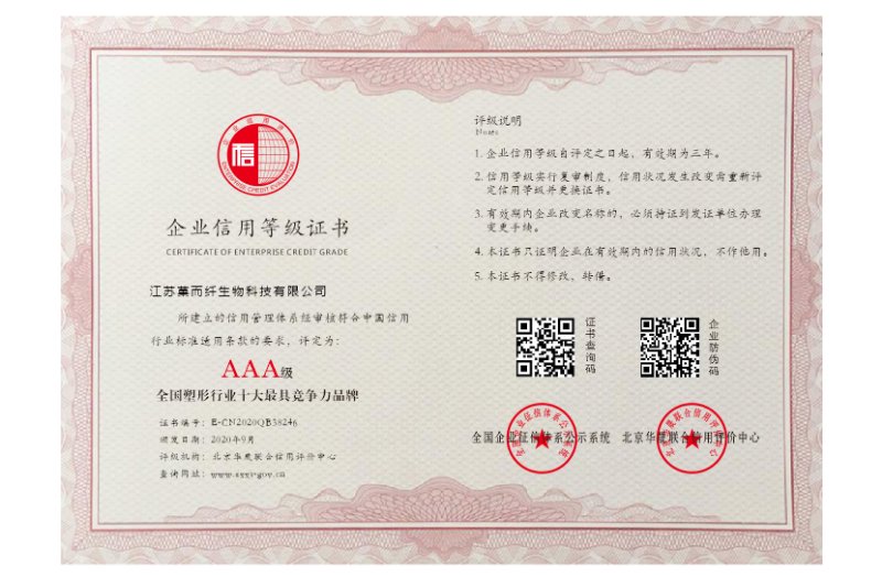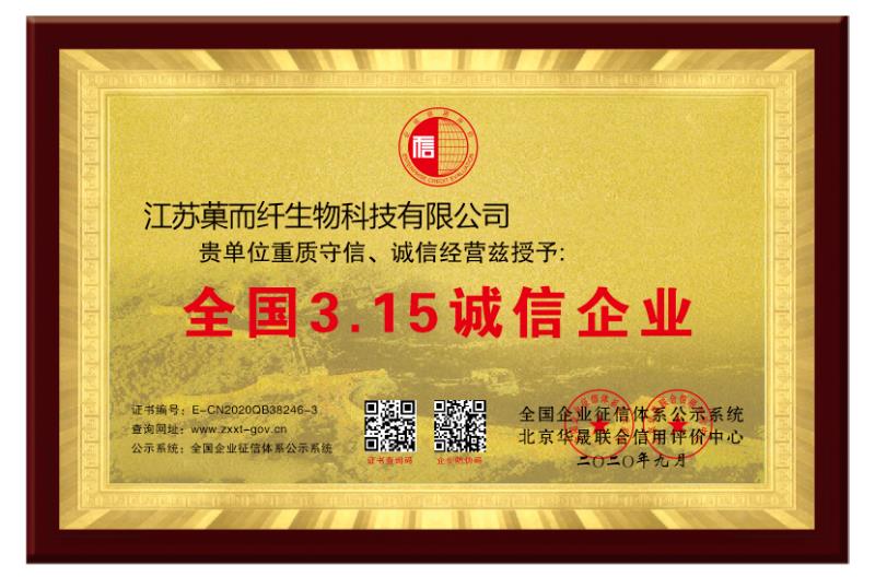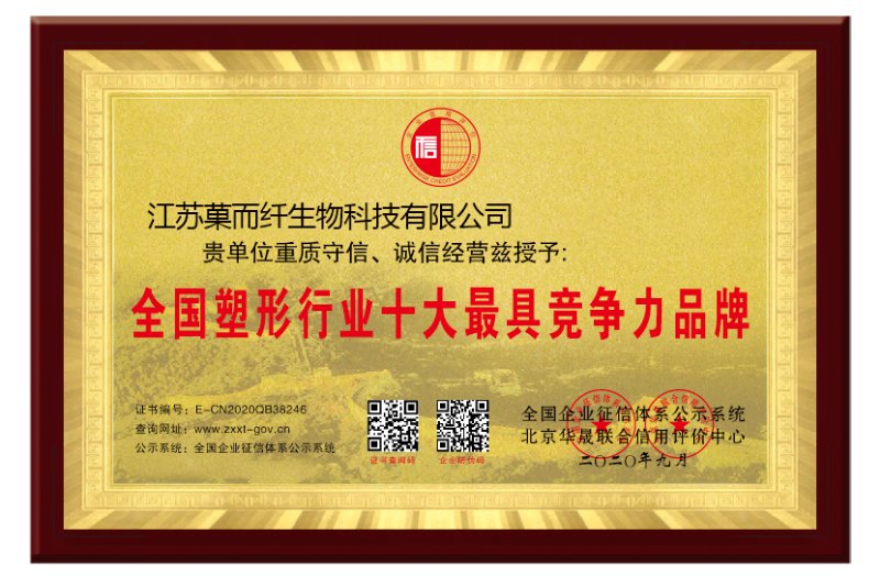 近日,江苏菓而纤生物科技有限公司凭借其健康理念产品创新,优质的服务和良好的信誉,在中国质量认证监督委员会和全国品牌认证联盟的一致审核评选下,在全国企业征信体系公示系统中荣获《全国塑形行业十大最具竞争力品牌》及《全国3.15诚信企业》等称号,可见其在品牌引领、自主创新,促进经济高质量发展上做出的成绩得到了社会的肯定。