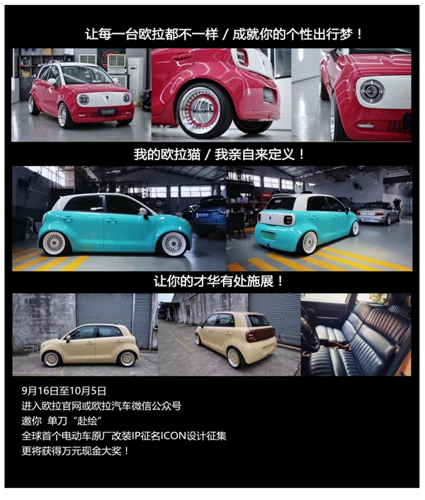 此话何解?就在最近,欧拉推出了全球首个电动车原厂改装IP的全网征名大赛和icon设计征集大赛,进击电动车改装领域,不管是征名还是icon设计,都有万元大奖可拿。想到全球首个电动车改装IP或将由你命名,或者你的icon设计被选中,是不是感觉有点心动呢?有一说一,我已参与了征名活动,并且开始基于我的欧拉黑猫,构思理想座驾外观设计!9月16日至10月5日 欧拉邀你单刀“赴绘”,进入欧拉官网或欧拉汽车微信公众号,给IP起名字,不只是文科生的事儿!