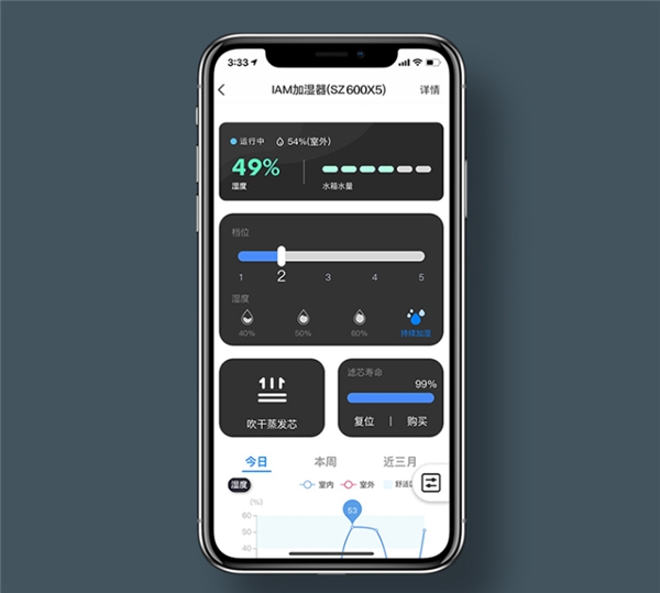 智能化是当下势不可挡的家居潮流,对环境电器来说更是如此,毕竟,空气干不干净、干湿是否得当,人体无法直观感知,需要借助精确的算法才能切实改善身边居住环境。作为一款高配置产品,IAM加湿器搭载了智能恒湿模式,在开启后可以自动检测室内湿度并进行智能调节,让空气湿度始终保持在60%的舒适水平。同时,与心够 App 连接后还可以自定义个人舒适湿度,并可以通过心够App远程操控,使用起来更加智能方便。