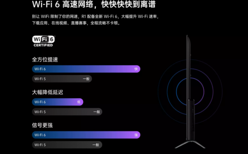 值得一提的是,OPPO智能电视R1还支持最新的Wi-Fi 6协议。相比较于Wi Fi 5,Wi-Fi 6的连接速率提升了4.2倍,延迟则最高降低了75%,即便是家庭中多个手机、平板、电视同时连接WiFi,也能保持网络顺畅。因此,使用OPPO智能电视R1下载应用更加快速、视频通话不会出现卡顿的情况、在观看赛事直播时,也不用担心因为网络延迟而错过精彩瞬间。