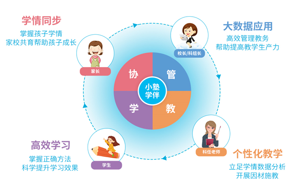同时,小塾学伴还将对教育过程中涉及的多方进行串联,信息在线实时同步,让校长、老师、家长可随时掌控学生学习情况,进一步加强家校共育能力。