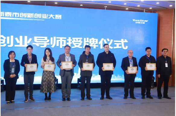 ▲新泰市委组织部副部长、人社局党组书记、局长侯诗荣,新泰市委组织部副部长、市人才工作领导小组办公室主任高秀洋为评委专家颁发启迪之星(新泰)创业导师证书