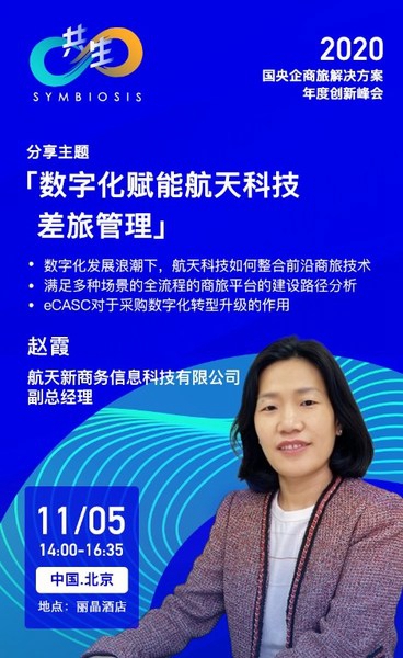 作为航天科技旗下商旅项目eCASC项目的主导者,航天新商务信息科技有限公司副总经理赵霞女士也将带来《数字化赋能航天科技差旅管理》的主题演讲。她将集中呈现数字化发展浪潮下,航天科技如何整合前沿技术,以管控、数据、开放一体化为核心建立满足多种场景的全流程的商旅平台,实现员工出行“免垫款、免贴票、免报销”,助力企业采购数字化转型升级。