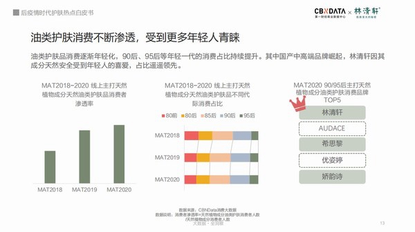随着近两年国货风潮在美妆护肤品类愈演愈烈,国产油类护肤备受关注,消费占比持续扩大。其中90后、95后的年轻消费者更偏爱国货,消费增速远高于其他代际。在具有修护功效的油类护肤品中,林清轩MAT2020销量超过娇兰、海蓝之谜等众多国际知名品牌,国产中高端品牌开始崛起。