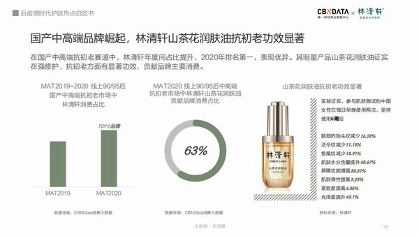 在国产中高端抗初老赛道中,林清轩年度间占比提升,2020年排名第一,表现优异。其明星产品山茶花润肤油证实在强修护、抗初老方面有显著功效。随着年轻人群抗初老需求增加,中高端市场,中林清轩贡献品牌消费达63%。