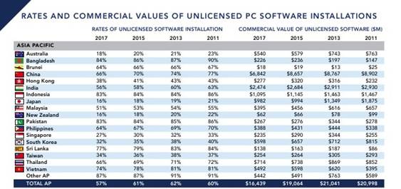 (《2018年全球软件调查报告》非授权软件使用率亚洲地区数据)