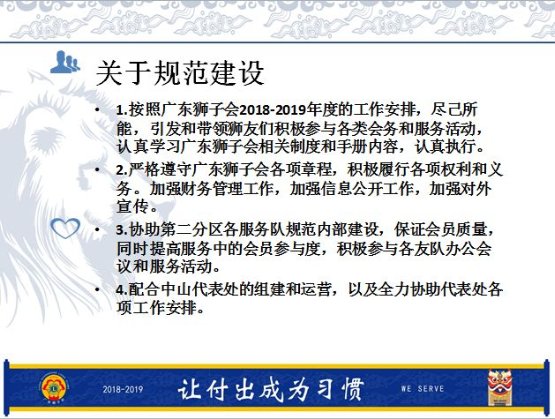 今天我非常荣幸成为香江服务队1819年度队长,我将传承和发扬香江服务队严谨规范的工作风格,继续努力践行我们的初心,在未来的日子里将和香江队30位狮兄狮姐携手完成使命。