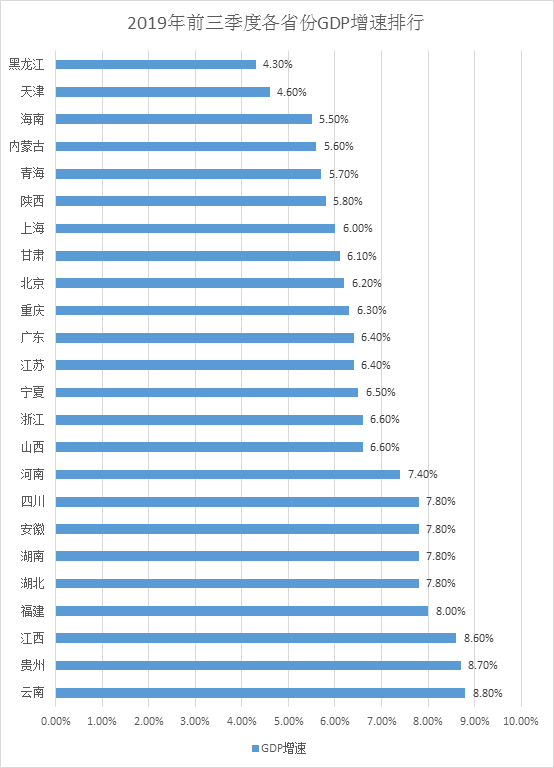 从前三季度经济增速上看,24省份中,16省份超越或持平于全国平均线。云南和贵州经济继续保持高增长。云南前三季度增速8.8%,超全国平均线2.6个百分点。贵州前三季度增速8.7%,这是贵州地区生产总值增速连续35个季度居全国前3位。黑龙江增速4.3%,暂时垫底。